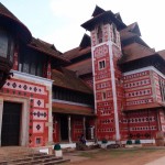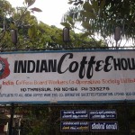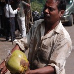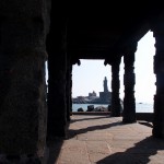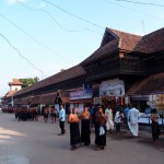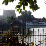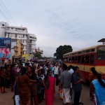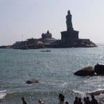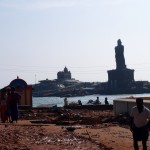 Kanyakumari is full of groups of male pilgrims in orange or black dhotis (loin cloths, as Gandhi wore) and holiday makers.  The streets are lined with market stalls.  An island with a colossal statue is just off shore, sun too bright to make out any detail, Indian tourists swim and play in the sea, some make devotions.  It’s very hot, despite being winter.  There’s an ancient pillared granite sun shelter, though during summer the rock must get too hot to touch.  I check out and catch the 1030 train to Trivandrum, capital of Kerala.